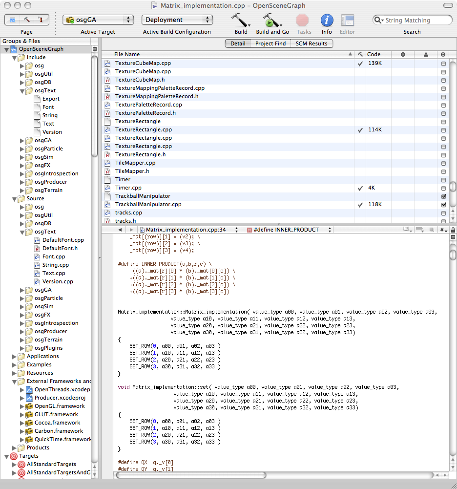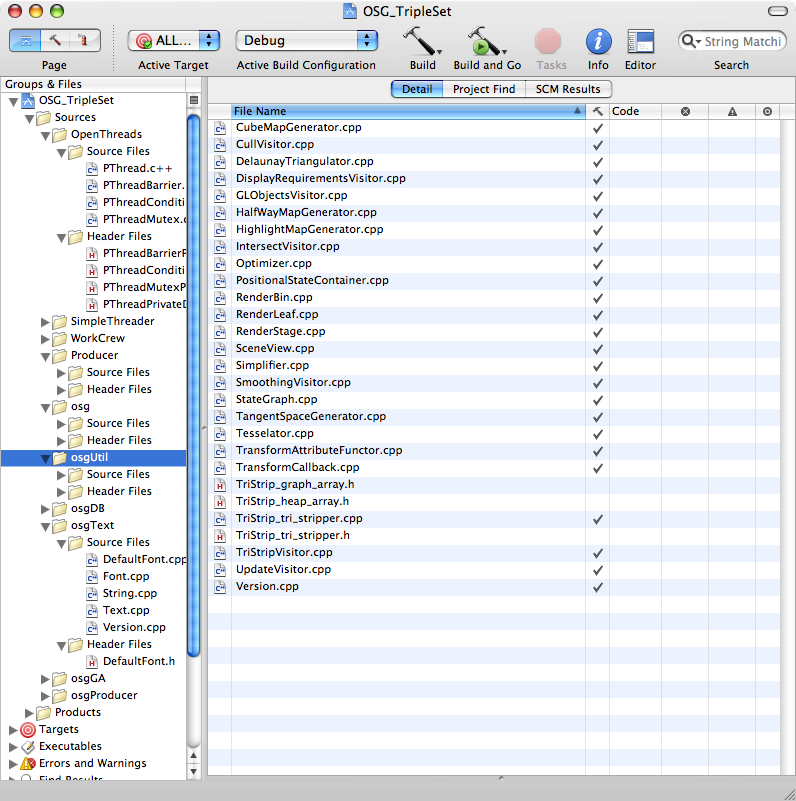 Since I'm here, I've been playing with the SOURCE_GROUP command, but so far nothing seems to be showing up for me (Xcode 2.4). OSG has a weird quirk that header files are extension-less, so I've been trying to use the SOURCE_GROUP command to list them, but I don't seem to get results any different than if I omit the command. Also, I wanted to share some screenshots to give you an idea of what this thread was talking about... |